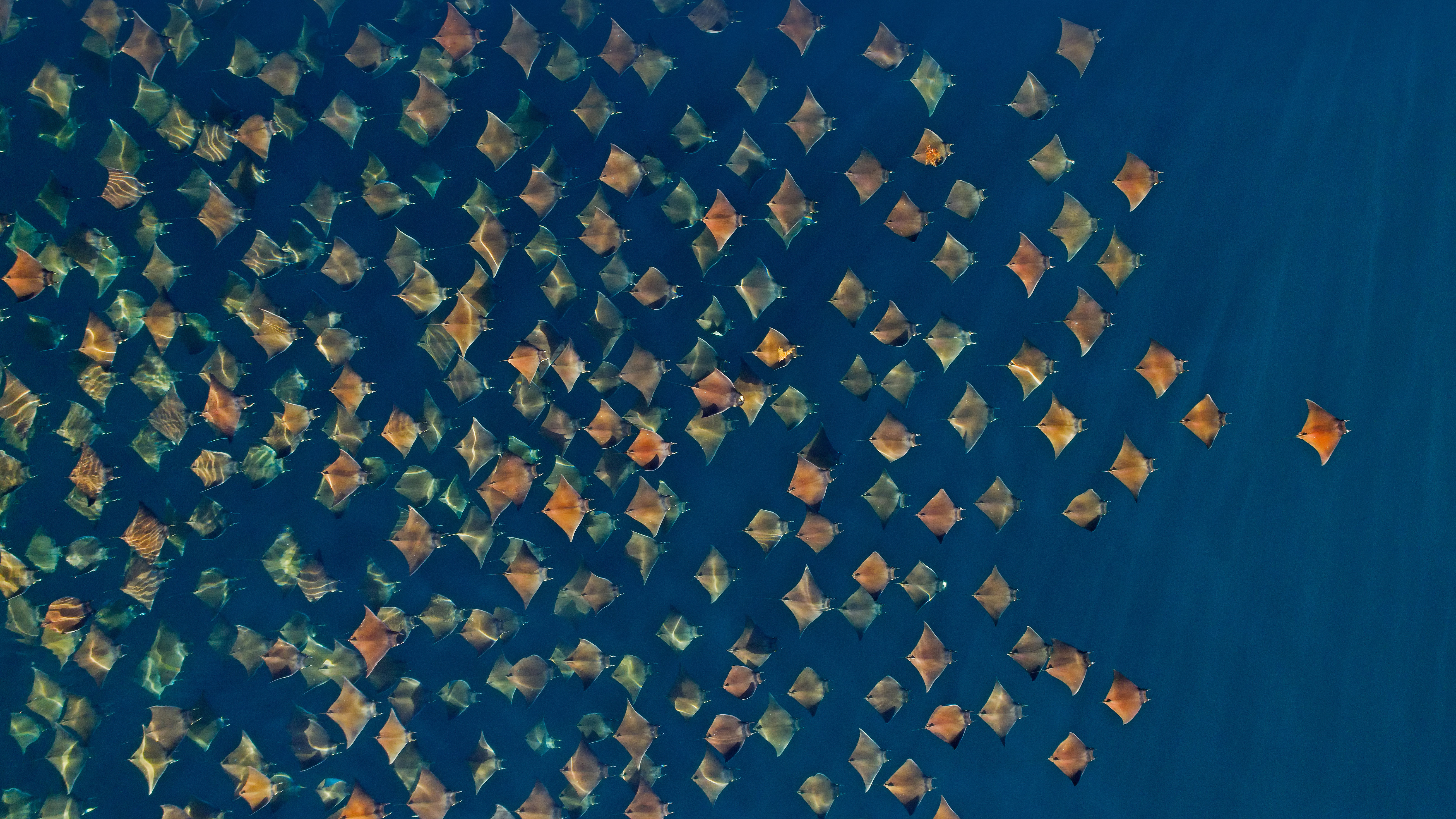 Large school of Munk's devil rays seen from the air