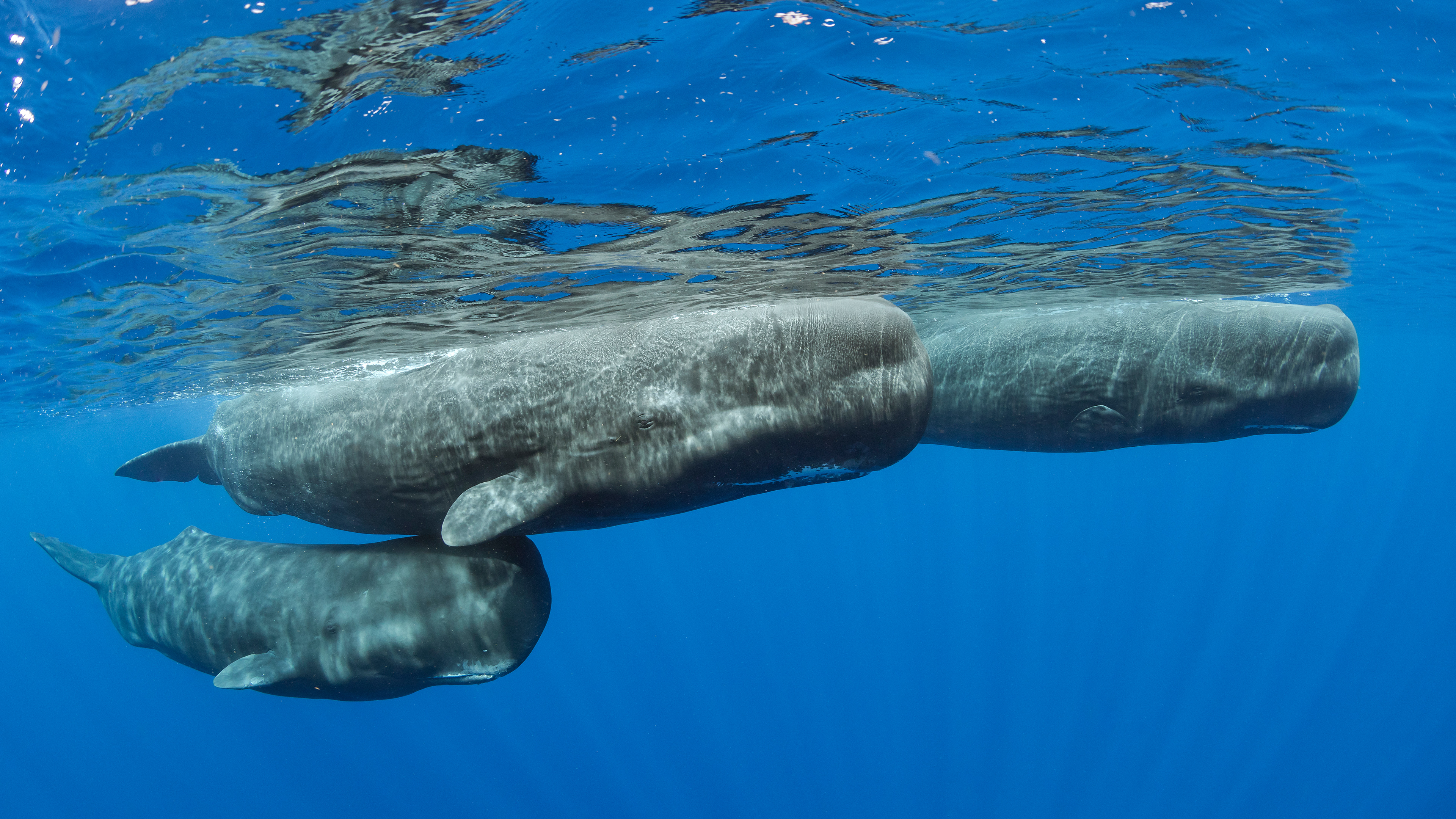 Sperm whale pod surfacing, Dominica (© Franco Banfi/Minden Pictures)