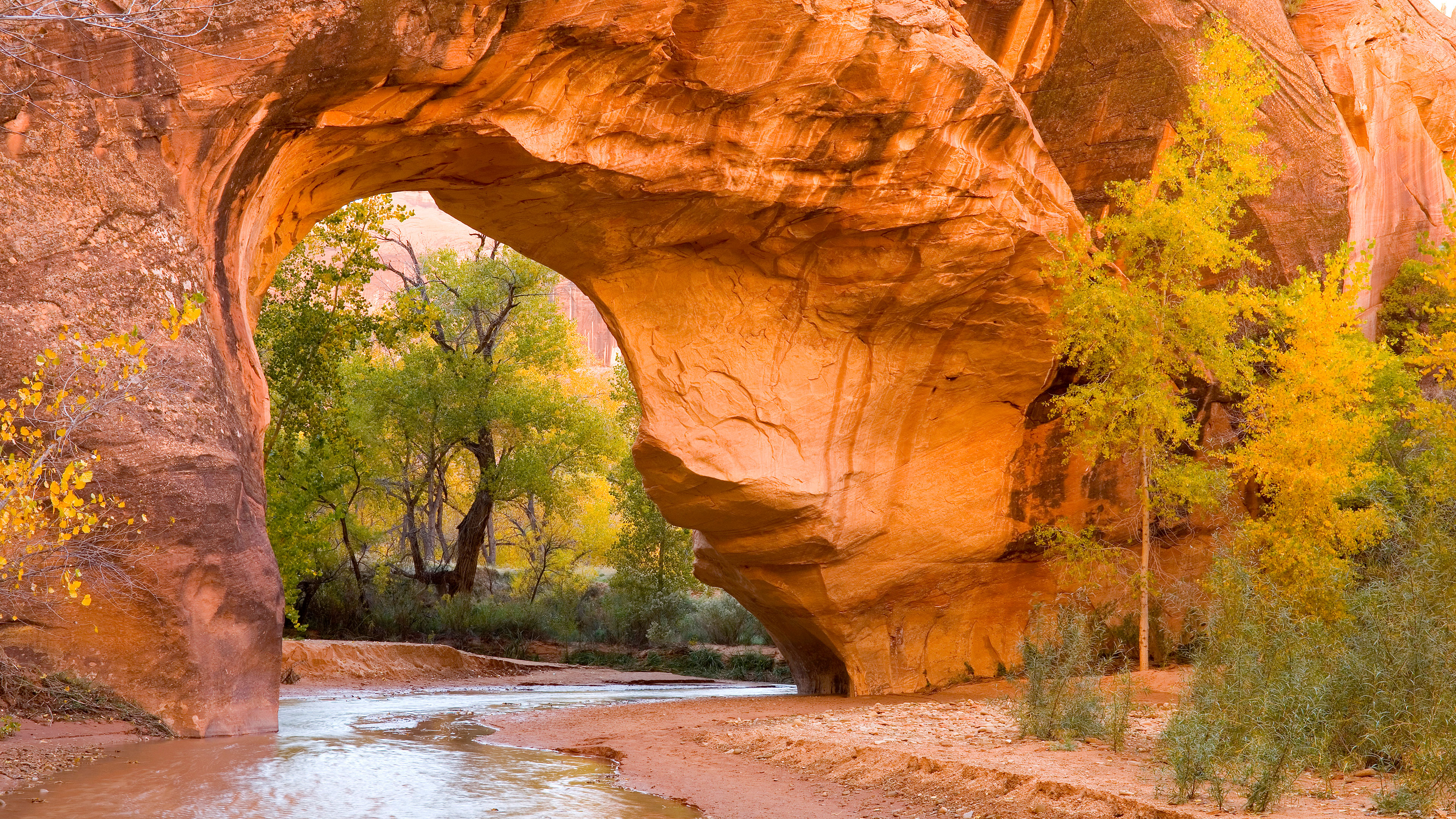 棉白杨s seen through an arch in Coyote Gulch, Glen Canyon Recreation Area, 犹他州 (© Stephen Matera/Tandem Stills + Motion)